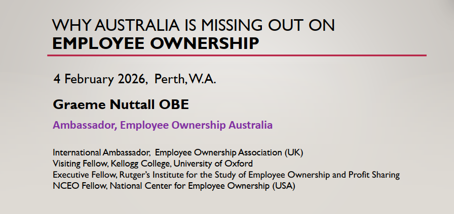 The recent Employee Ownership Australia (EOA) roundtable held on 4 February 2026, “Why is Australia Missing Out on the Employee Ownership Success Story?”, featured Graeme Nuttall OBE, international authority on employee ownership and architect of the UK’s successful policy framework. The event was hosted by EOA with the law firm, King & Wood Mallesons. There was an option to attend remotely, with a recording of the event now available.